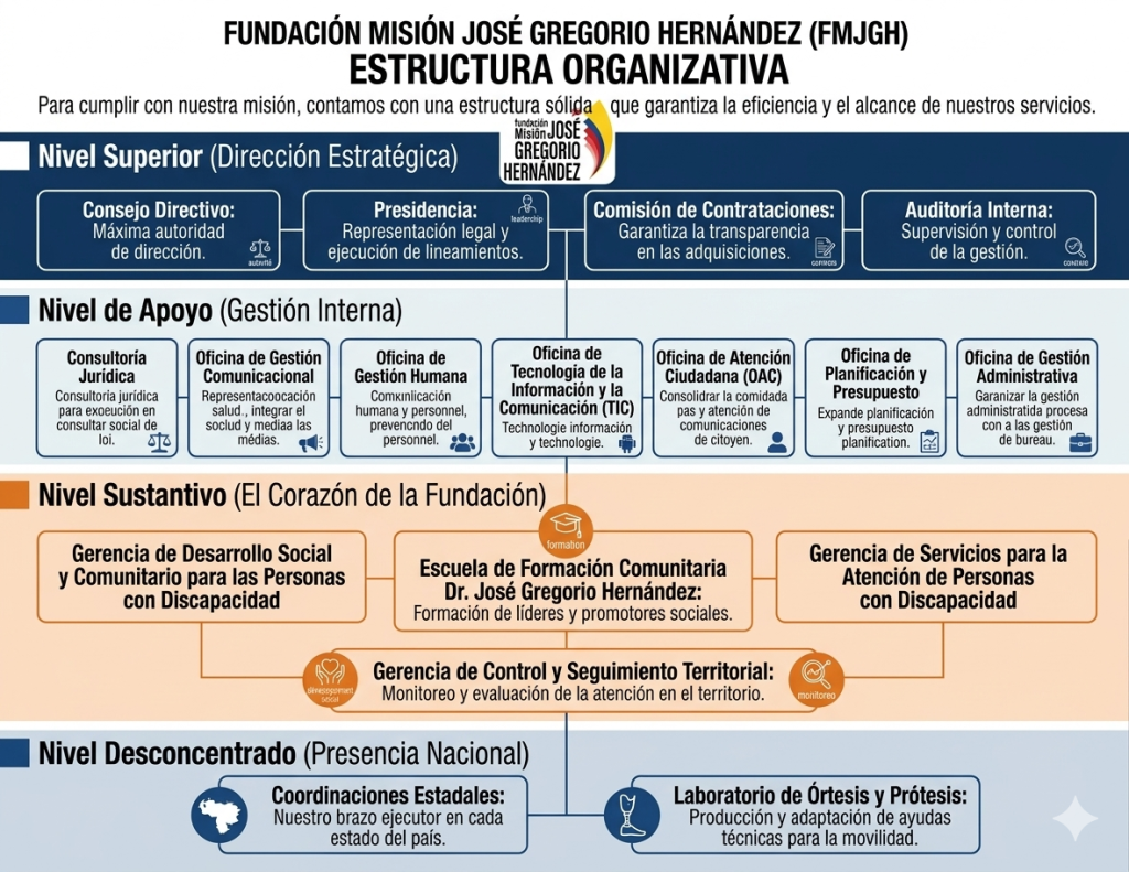 La Fundación Misión José Gregorio Hernández (FMJGH) es la institución del Estado venezolano creada para garantizar el bienestar de las personas con discapacidad. Nacimos el 17 de octubre de 2013, mediante Decreto Presidencial Nº 556, publicado en Gaceta Oficial Nº 40.280, con el firme propósito de diseñar y ejecutar políticas sociales que promuevan la inclusión, la prevención y la atención integral en todo el territorio nacional.