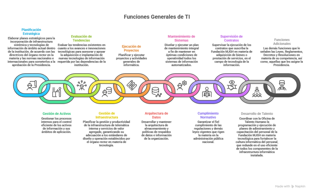 Misión Operativa: | Garantizar la incorporación, gestión, seguridad, y mantenimiento eficiente de la infraestructura sistémica y las tecnologías de información de la Fundación MJGH, alineadas con las normativas nacionales e internacionales y las directrices del órgano rector, para apoyar la gestión operativa y estratégica de la institución. |