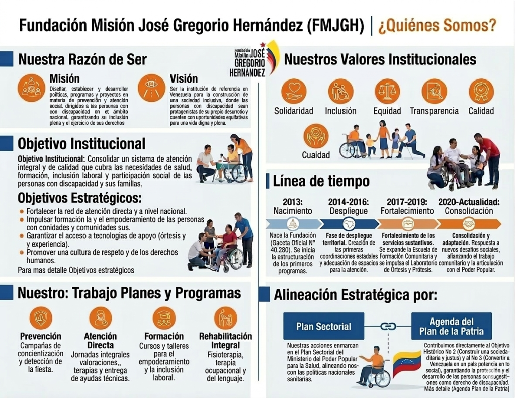 La Fundación Misión José Gregorio Hernández (FMJGH) es la institución del Estado venezolano creada para garantizar el bienestar de las personas con discapacidad. Nacimos el 17 de octubre de 2013, mediante Decreto Presidencial Nº 556, publicado en Gaceta Oficial Nº 40.280, con el firme propósito de diseñar y ejecutar políticas sociales que promuevan la inclusión, la prevención y la atención integral en todo el territorio nacional.